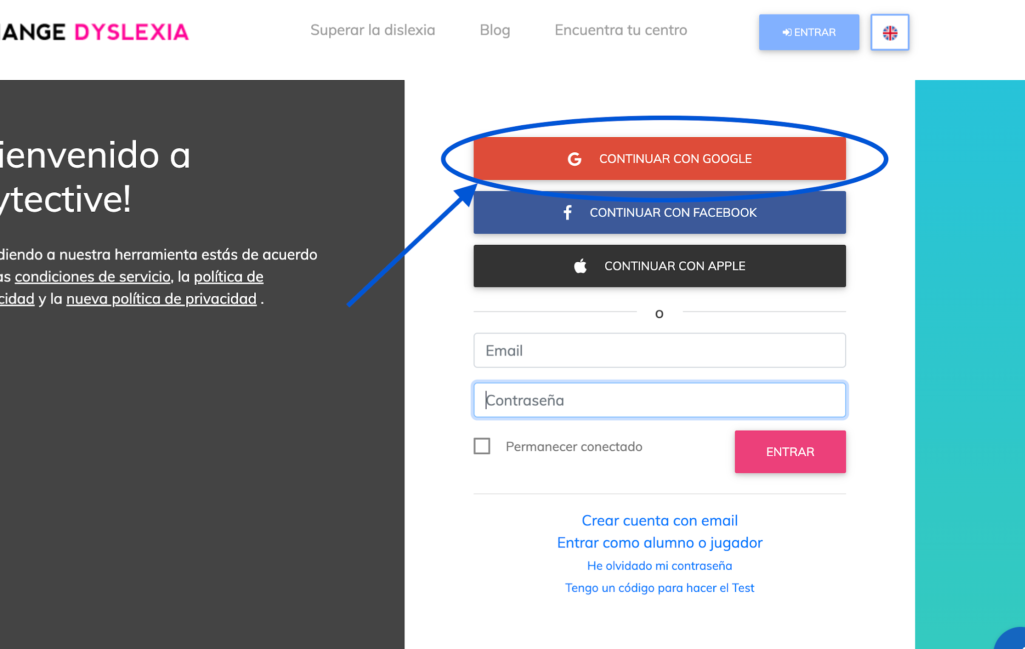 Entra en la página de inicio de sesión de Dytective en el siguiente enlace: https://www.changedyslexia.org/signin