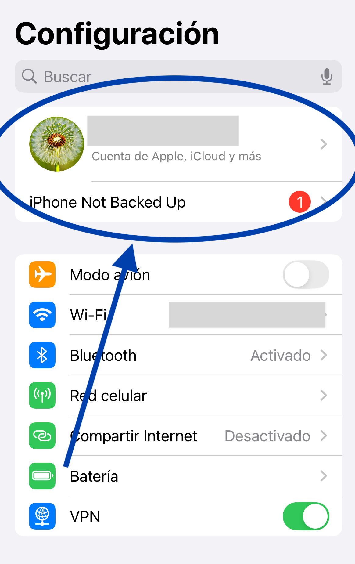 Abre la app de Configuración y pulsa sobre tu nombre para acceder a los ajustes del ID de Apple.