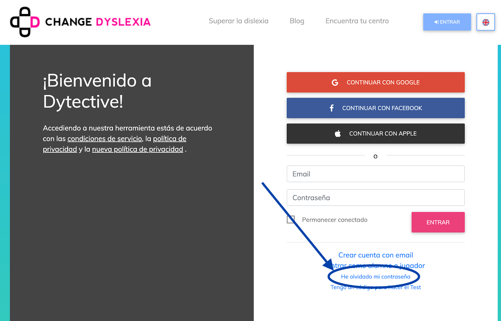 Accede a la página de inicio de sesión de Dytective: https://www.changedyslexia.org/signin