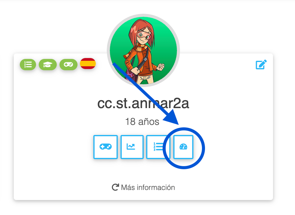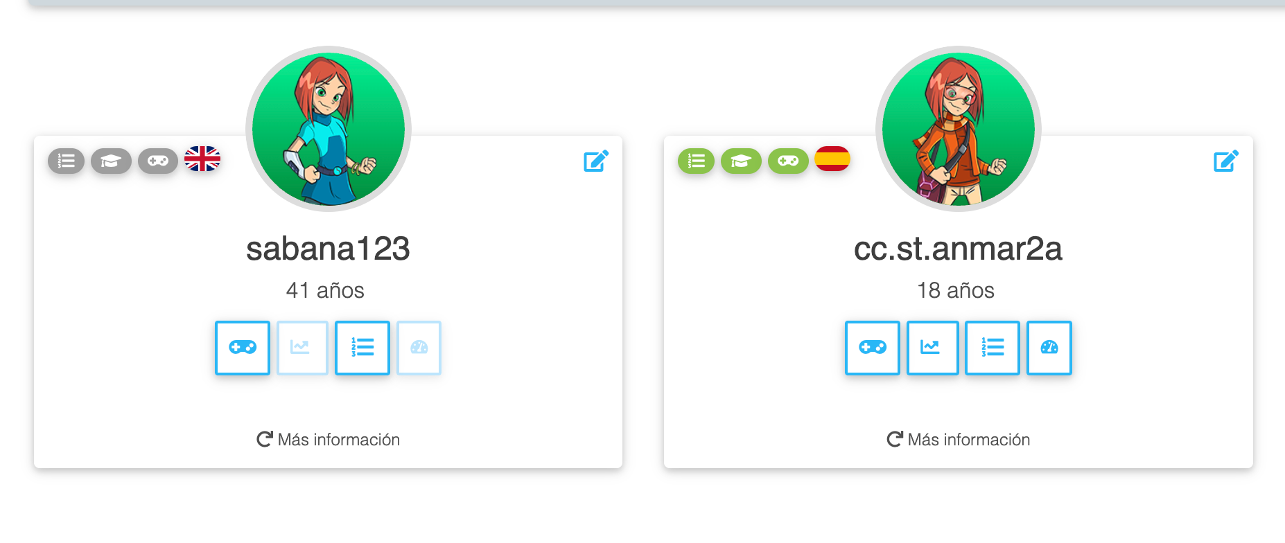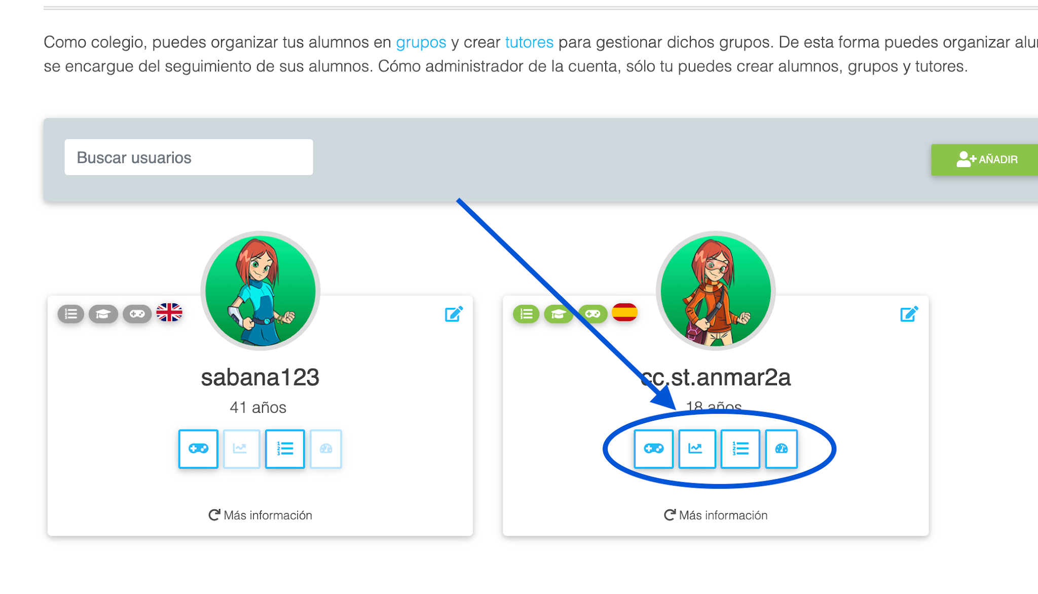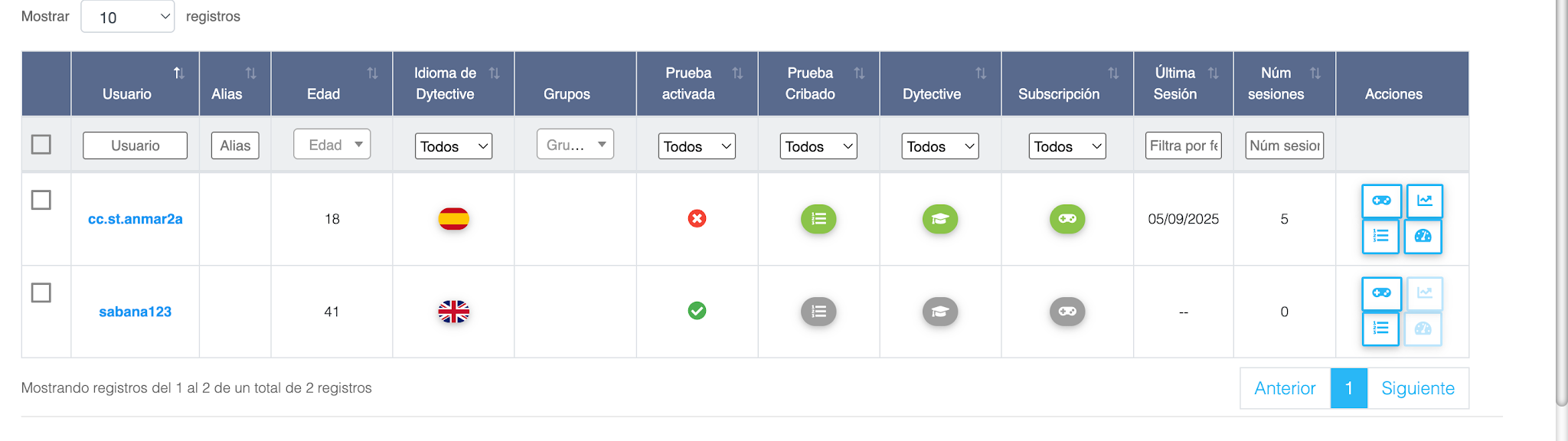 Cada usuario tiene 4 botones debajo del nombre (en el modo tarjetas) o a la derecha (en el modo tablas).