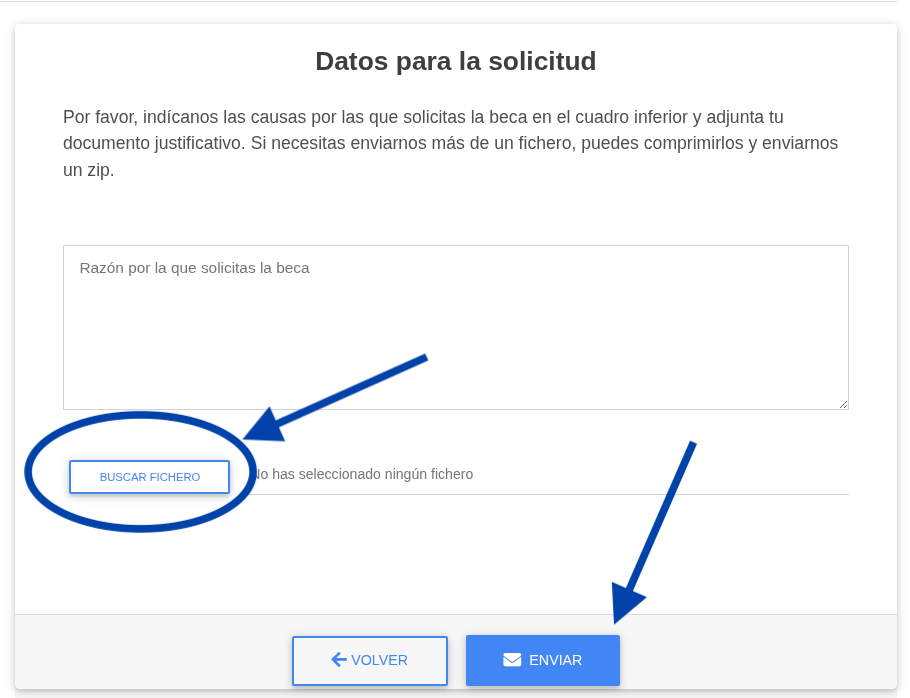 6. Escribe el motivo de tu solicitud de beca y adjunta el documento correspondiente (solicitud o justificante de una beca previa en alguno de los organismos indicados en la página de becas). A continuación, pulsa “Enviar”.