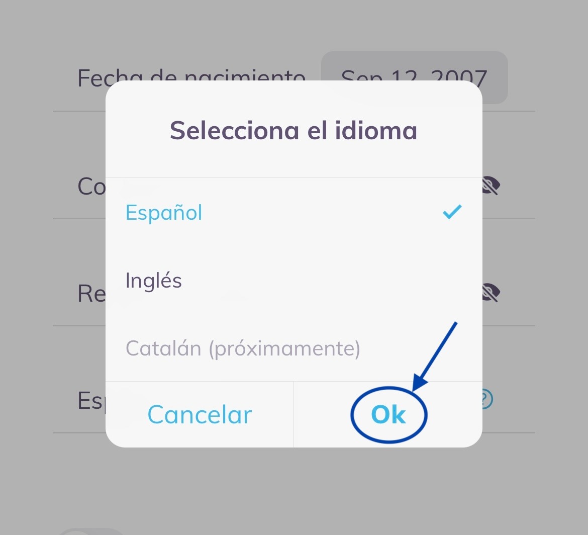 Para cambiar el idioma, pulsa encima del idioma (actualmente, español e inglés y, próximamente catalán):