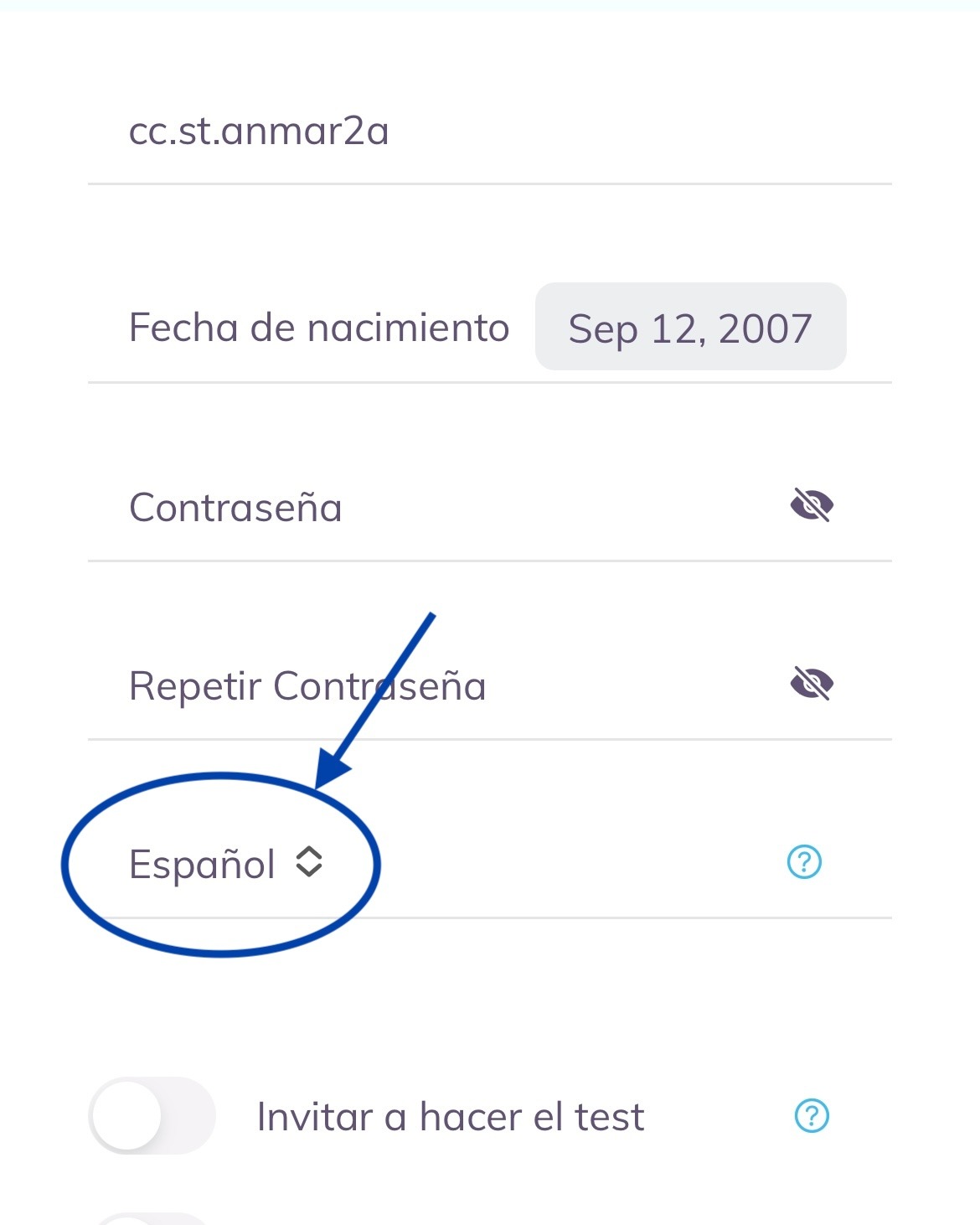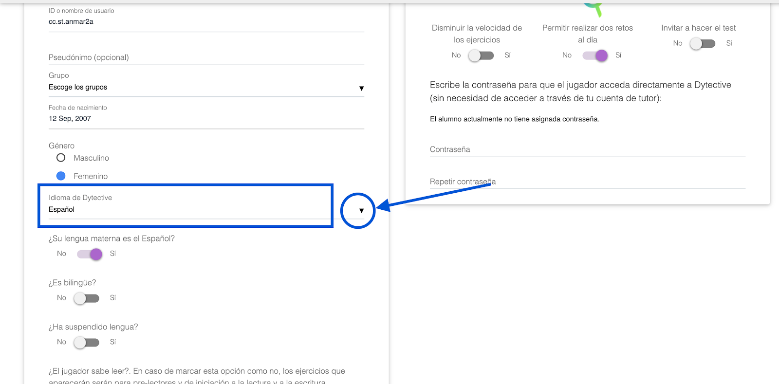 En la siguiente página podrás configurar los datos del usuario jugador. Para cambiar el idioma, pulsa la flecha a la derecha del idioma: