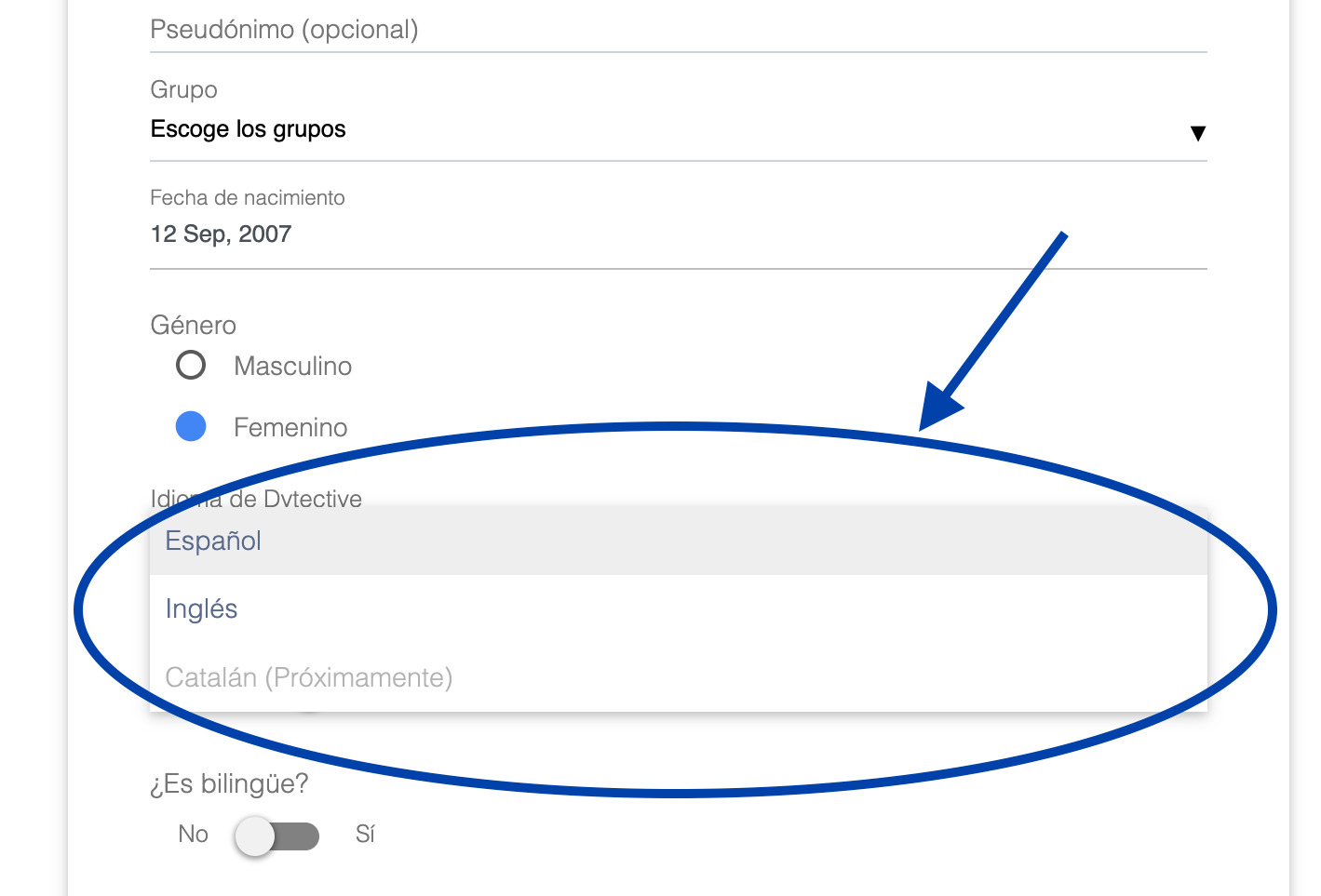 Aparecerán otras opciones de idiomas. Actualmente, Dytective está en español e inglés y próximamente estará disponible en catalán. Escoge el idioma deseado.