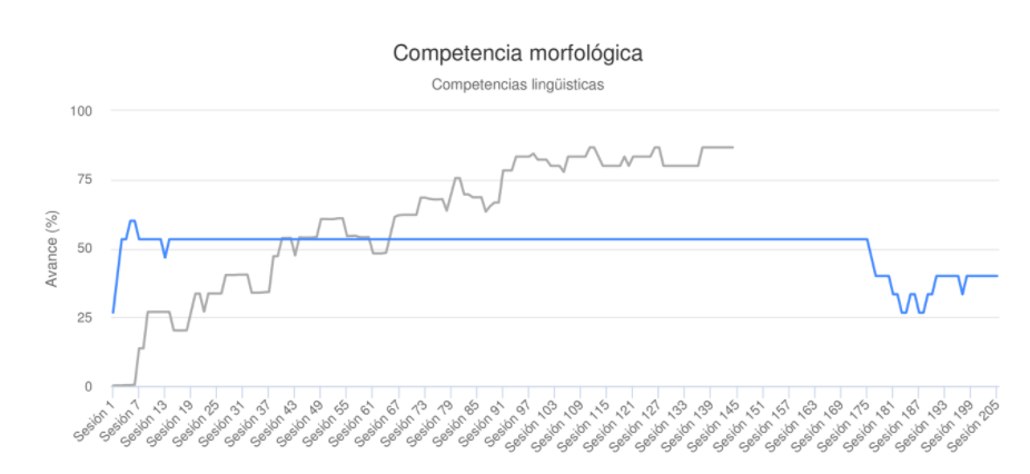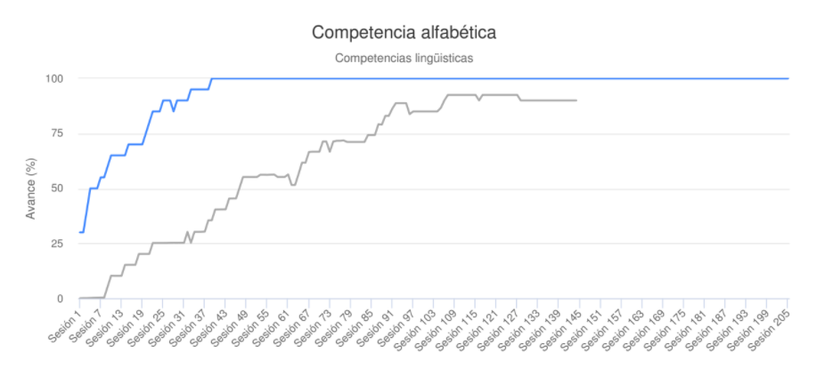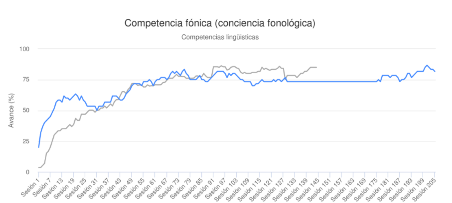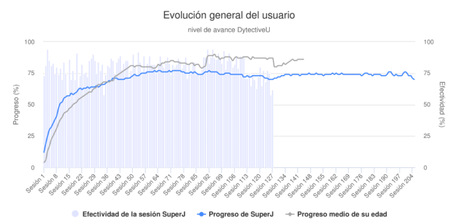 A medida que los niveles aumentan en dificultad, las mejoras se vuelven más lentas y menos visibles. Superado el 75 % del progreso total, las gráficas tienden a estabilizarse, ya que el alumno está trabajando niveles más exigentes.