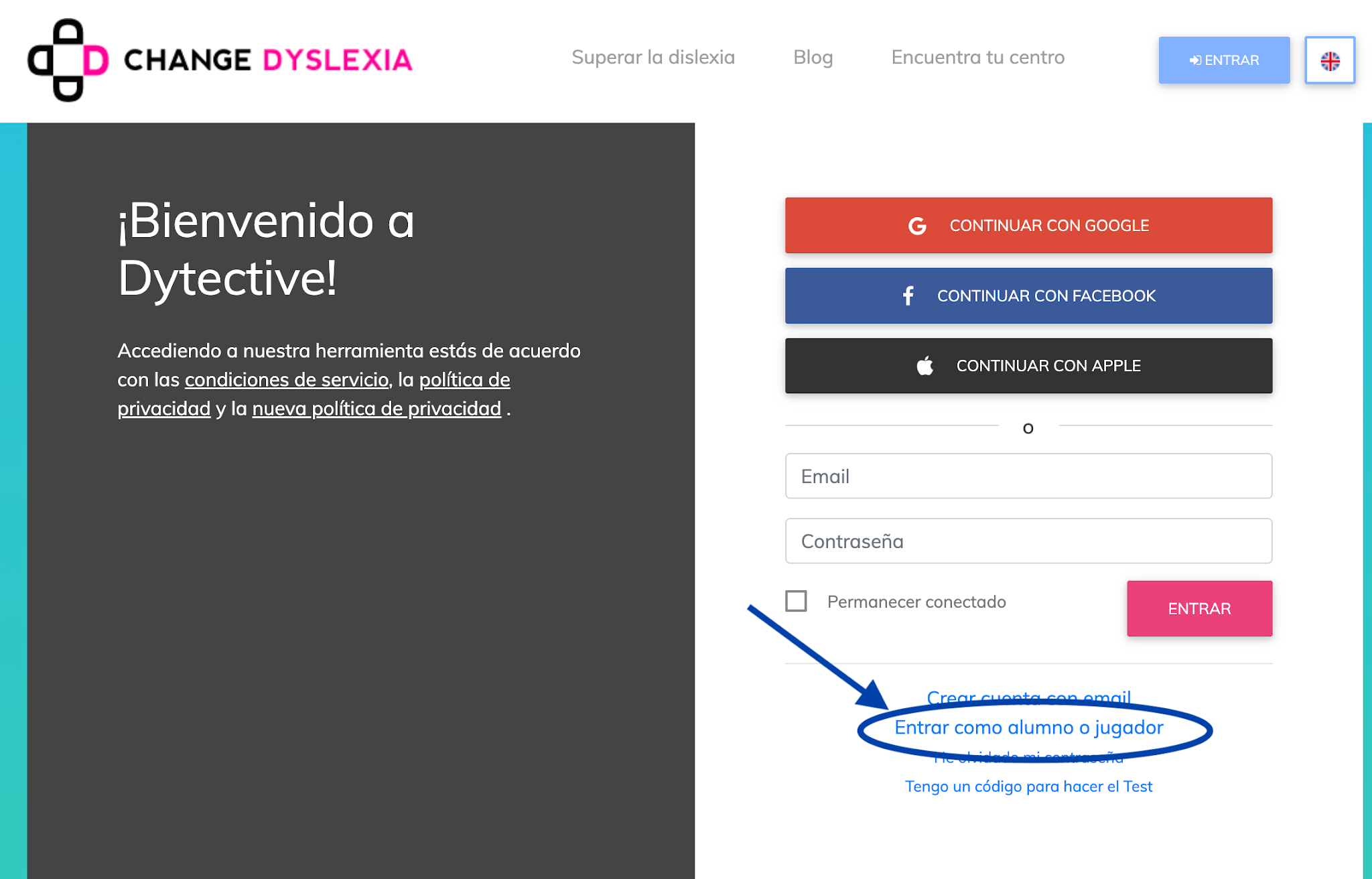 Entrar en www.changedyslexia.org/signin y pulsar “Entra como alumno o jugador”.