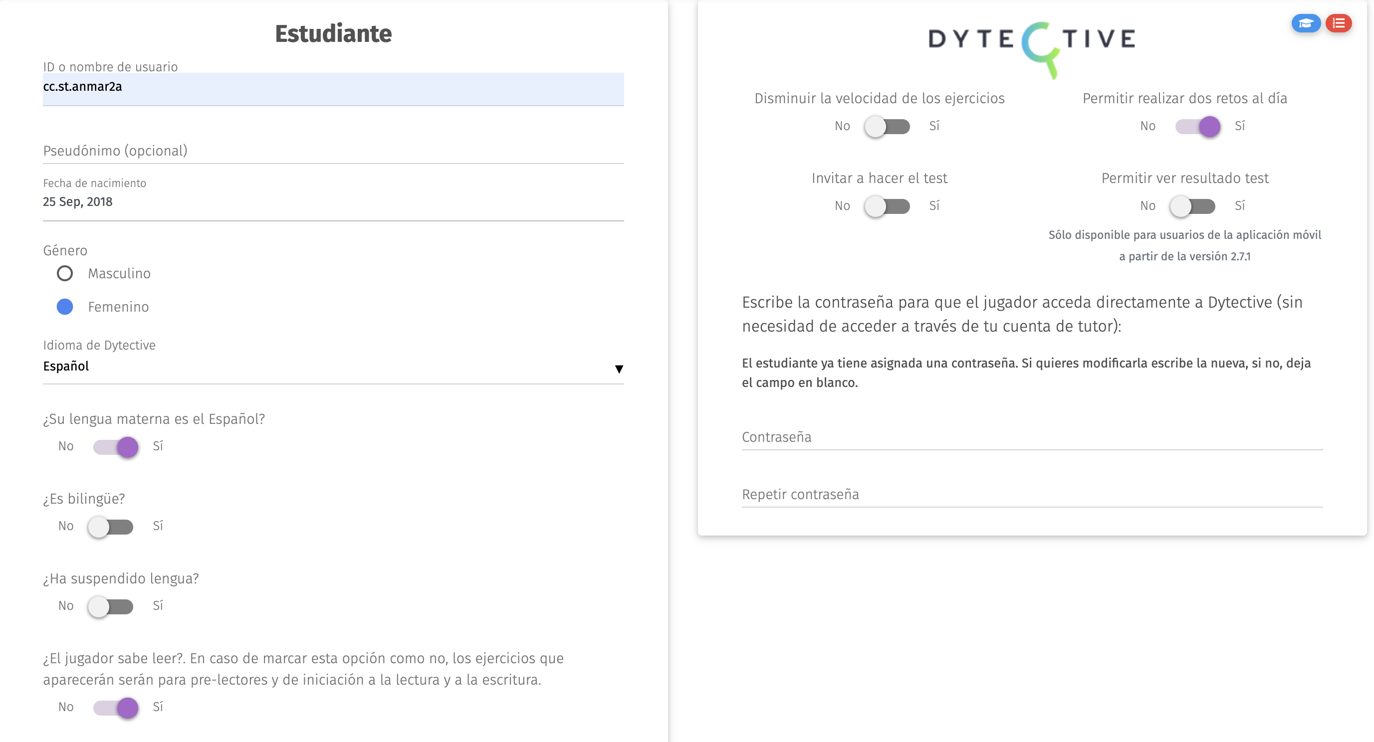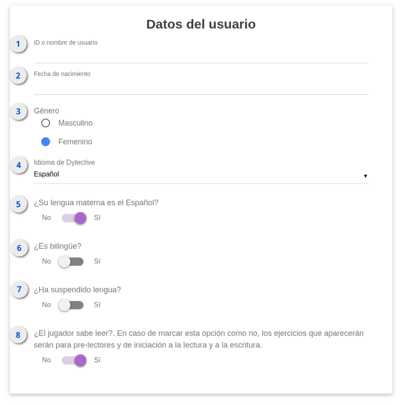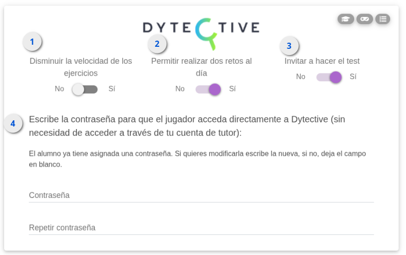 Preguntas sobre el usuario jugador: puedes modificar la respuesta a estas preguntas haciendo clic encima del selector. Es importante que la información sea veraz para que los ejercicios de Dytective se ajusten al perfil del usuario: