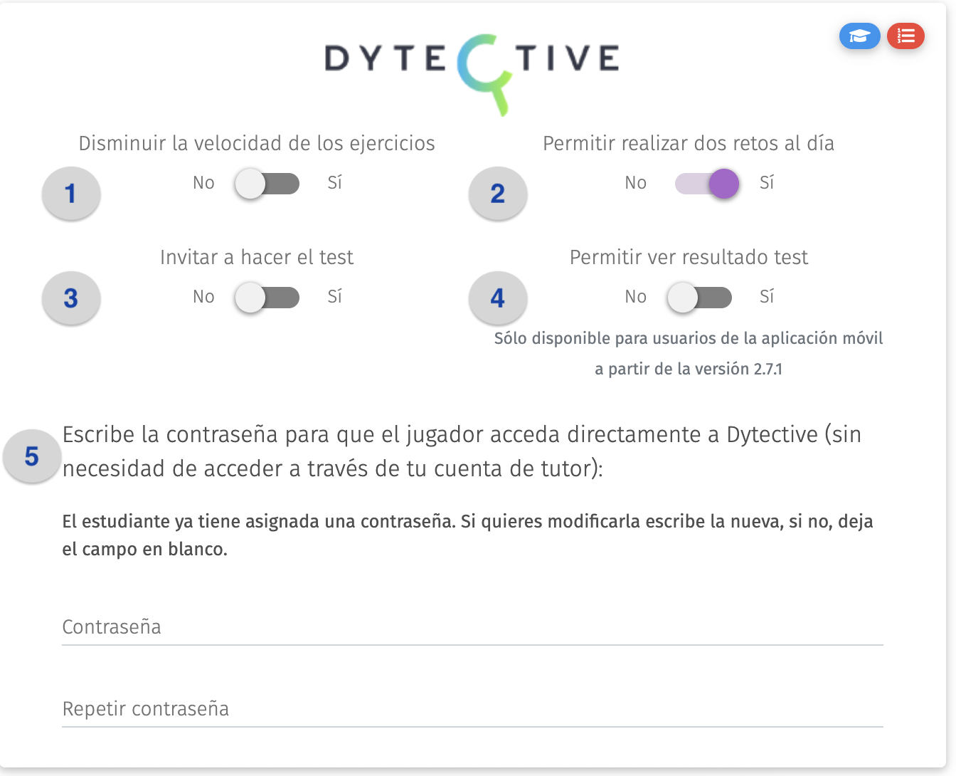 5. Contraseña del usuario jugador: En este apartado se puede configurar una contraseña de acceso para que el usuario jugador pueda entrar directamente en sus sesiones de Dytective indicando su ID de usuario y su contraseña.