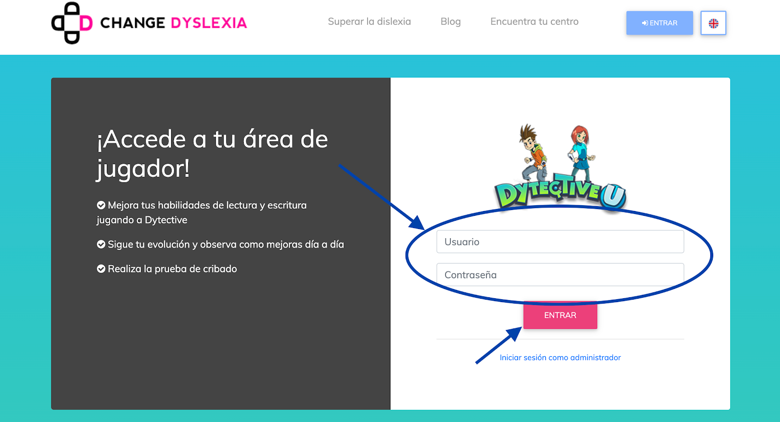 Si el administrador ha introducido una contraseña en el perfil del estudiante, este podrá entrar directamente:Desde la web entrando en https://www.changedyslexia.org/signin/dyu y escribiendo sus credenciales.