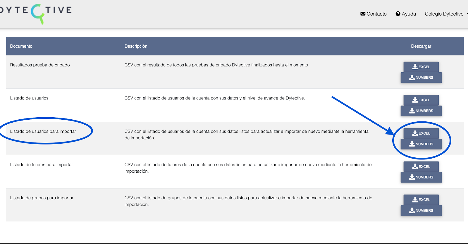 En la pantalla Descargas, descarga el archivo “Listado de usuarios para importar” en el formato que prefieras (Excel o Numbers, si trabajas con Apple).