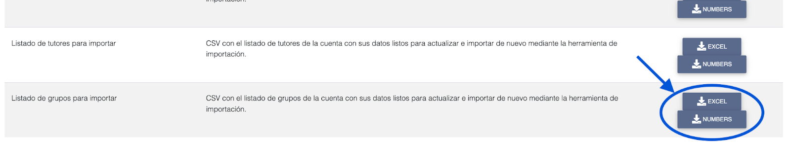 En la pantalla Descargas, descarga el archivo “Listado de grupos para importar” en el formato que prefieras (Excel o Numbers, si trabajas con Apple).