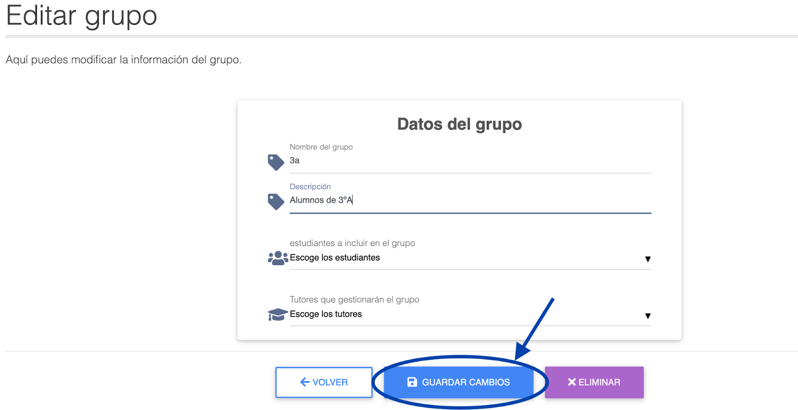 Aquí podrás editar todos los datos del grupo: nombre, descripción y opcionalmente, podrás añadir estudiantes y tutores. Cuando termines de modificar, pulsa “Guardar cambios”.
