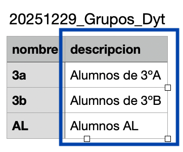 Al editar los grupos en CSV sólo podrás modificar su Descripción. No podrás modificar el nombre, pues se crearía un duplicado, y si quieres cambiar los alumnos o tutores en cada grupo con el CSV, tendrás que hacerlo desde el respectivo CSV (de alumnos o de tutores, respectivamente).