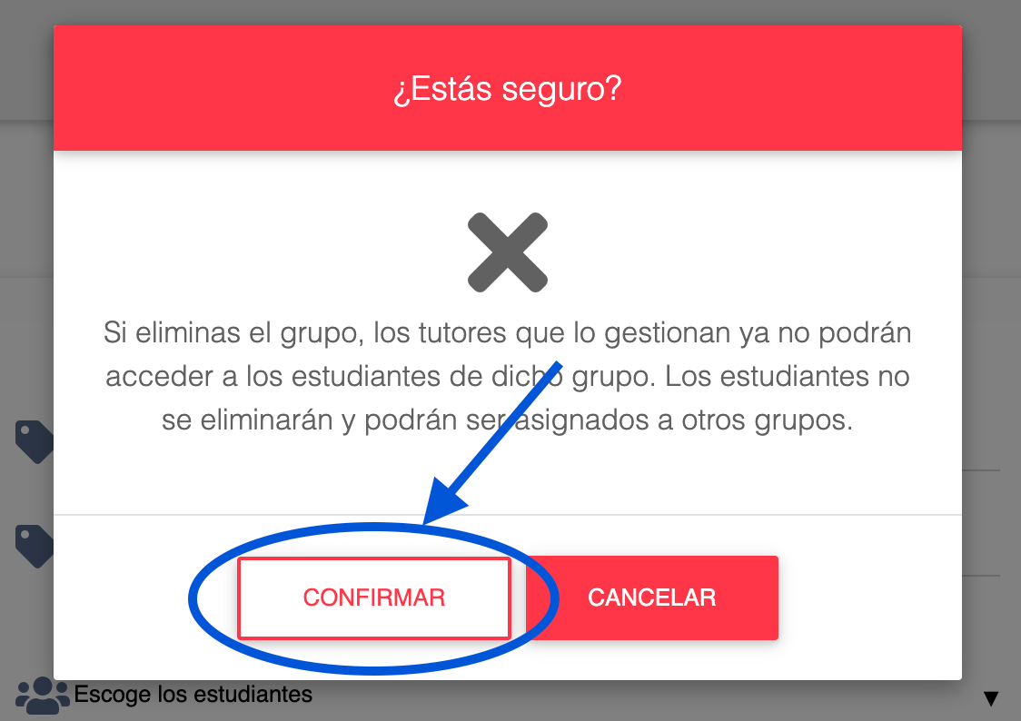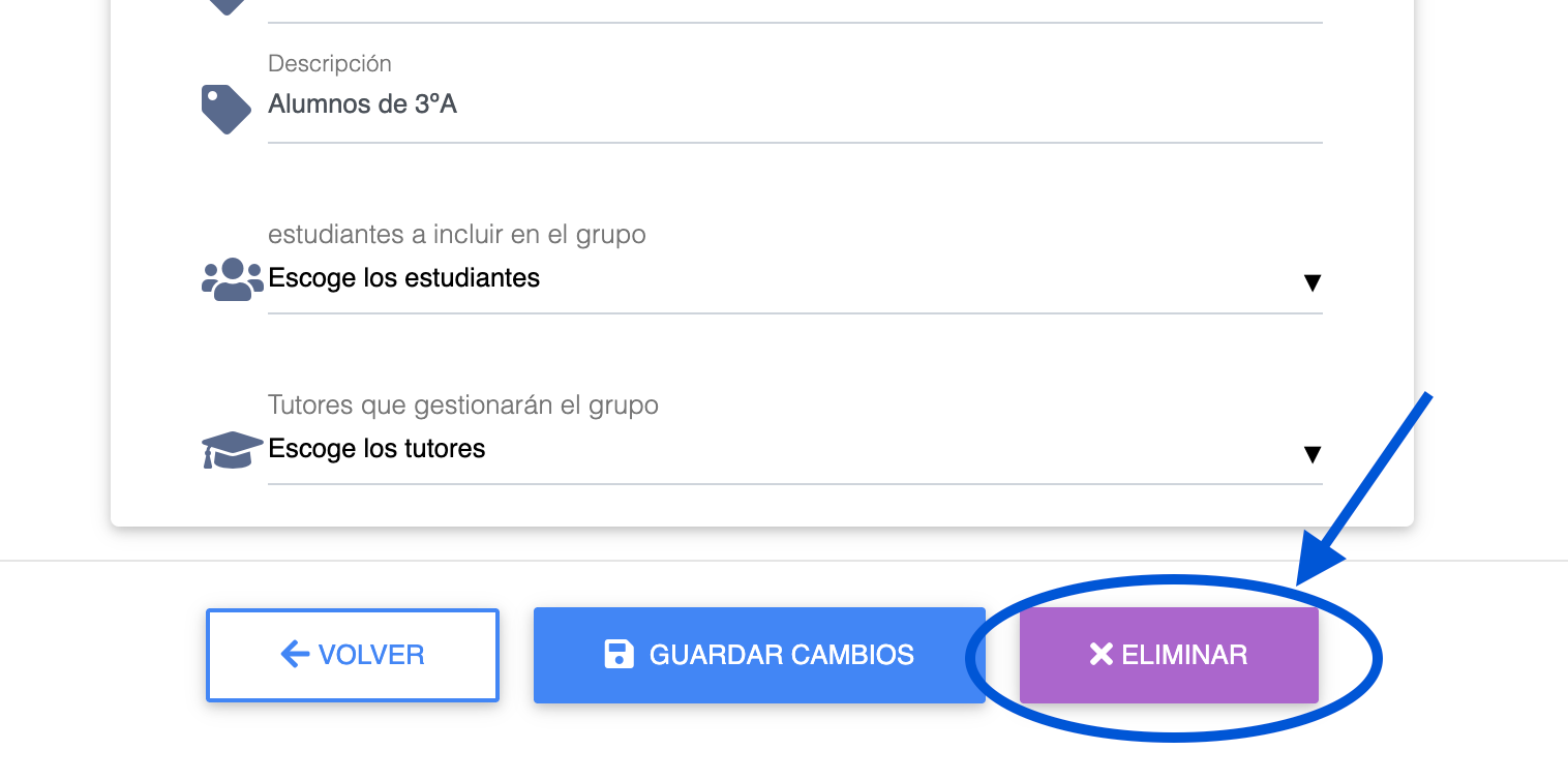 Sólo se puede eliminar grupos de manera manual. Al eliminar un grupo, no eliminarás ni los estudiantes ni los tutores asignados a dichos grupos.