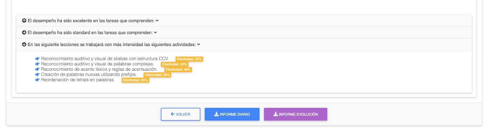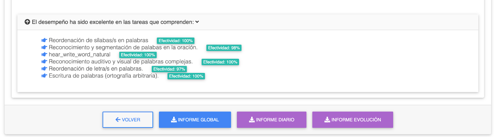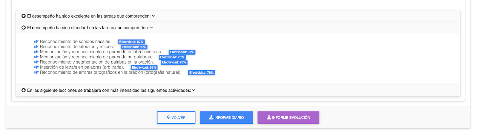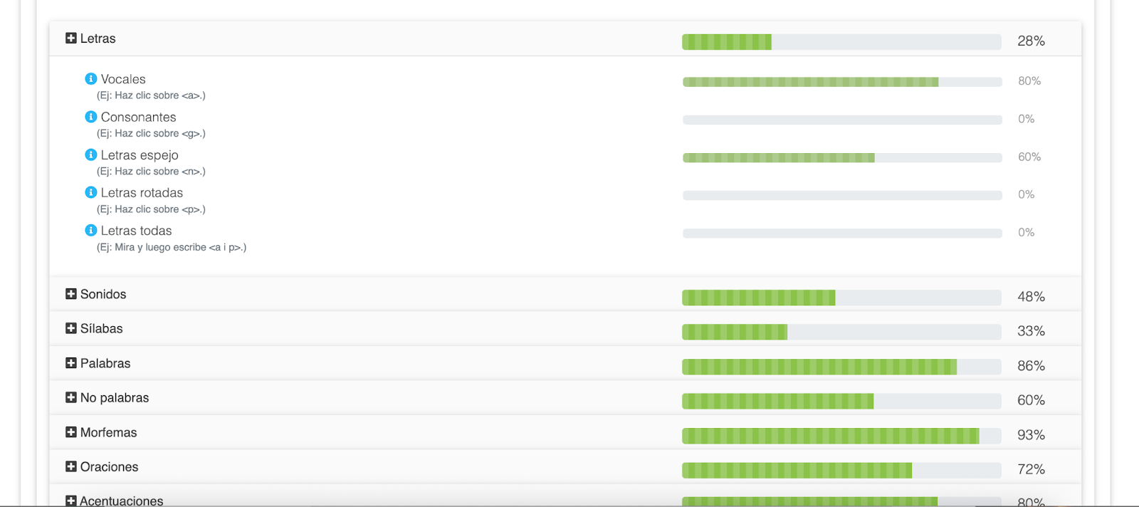 Cuando el estudiante alcanza el nivel 5 (máximo) en todos los subtipos de ejercicios, llega al 100% del progreso Dytective. Una vez alcanzado este porcentaje, el usuario puede seguir jugando para consolidar y mantener las habilidades adquiridas.