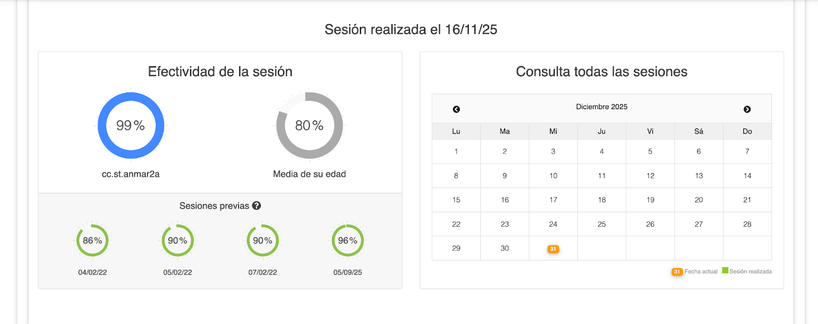 Si el estudiante realiza más de una sesión el mismo día, el informe mostrará la media de ese día (combinando ambas sesiones).