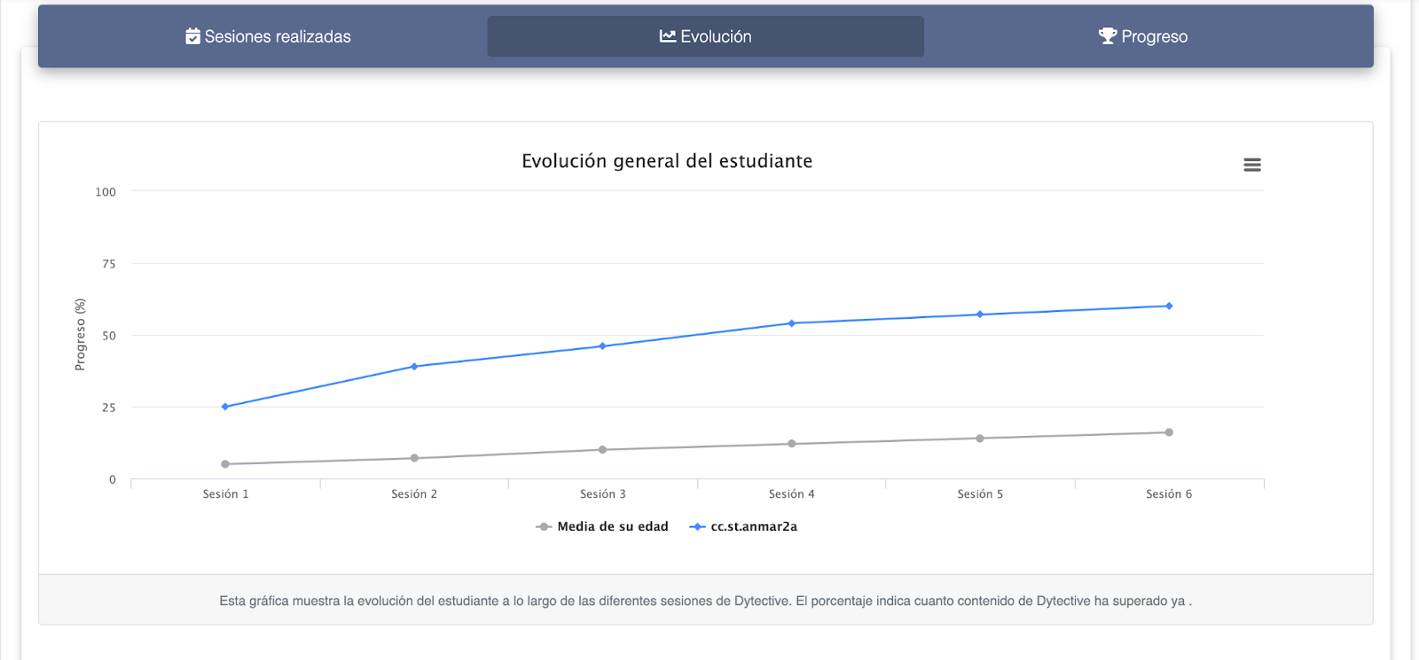 El tutor o el administrador pueden consultar la evolución del usuario jugador a lo largo de las distintas sesiones. Para ello, deberán pulsar el botón “Evolución” dentro del perfil del estudiante que quieran gestionar.