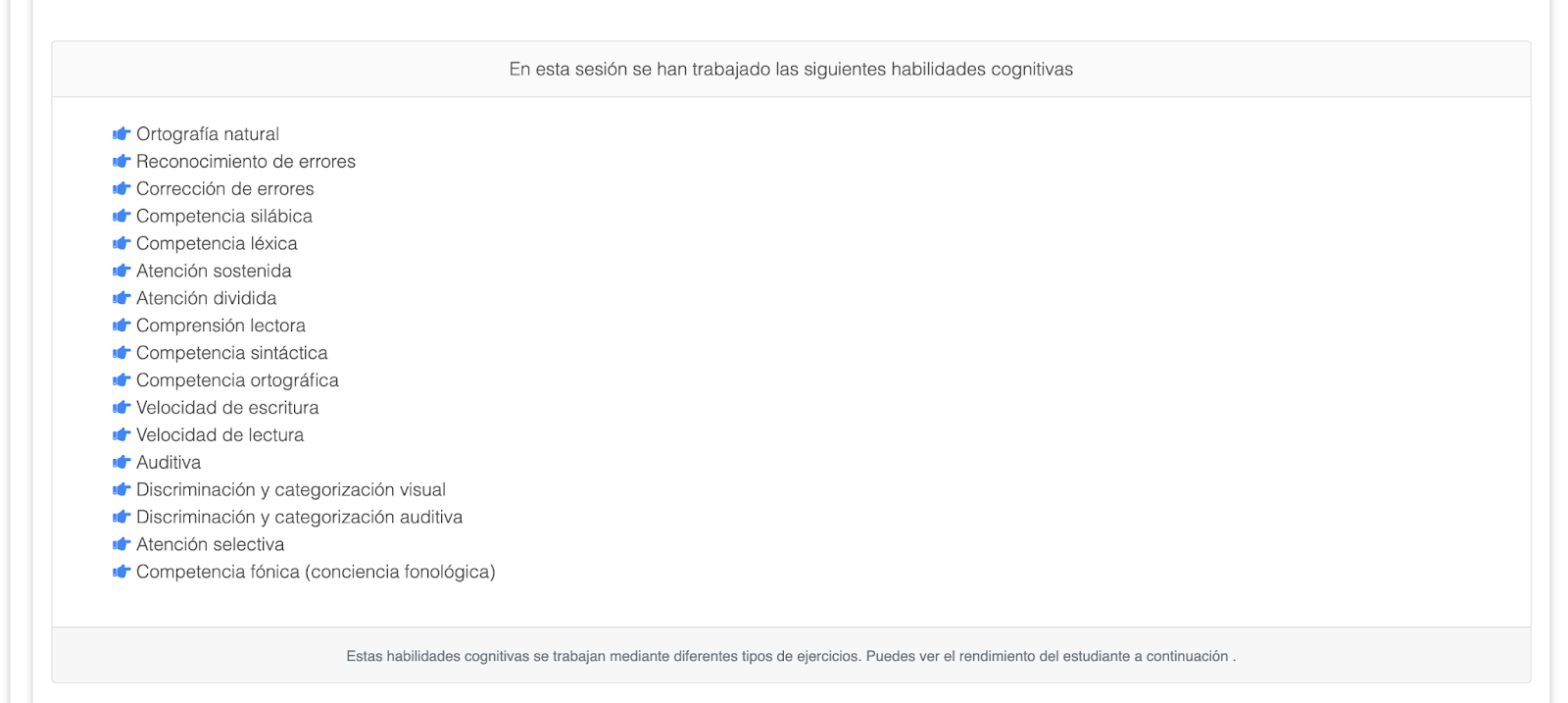 Por último, verás un resumen que agrupa las habilidades según el desempeño del estudiante en esa sesión: