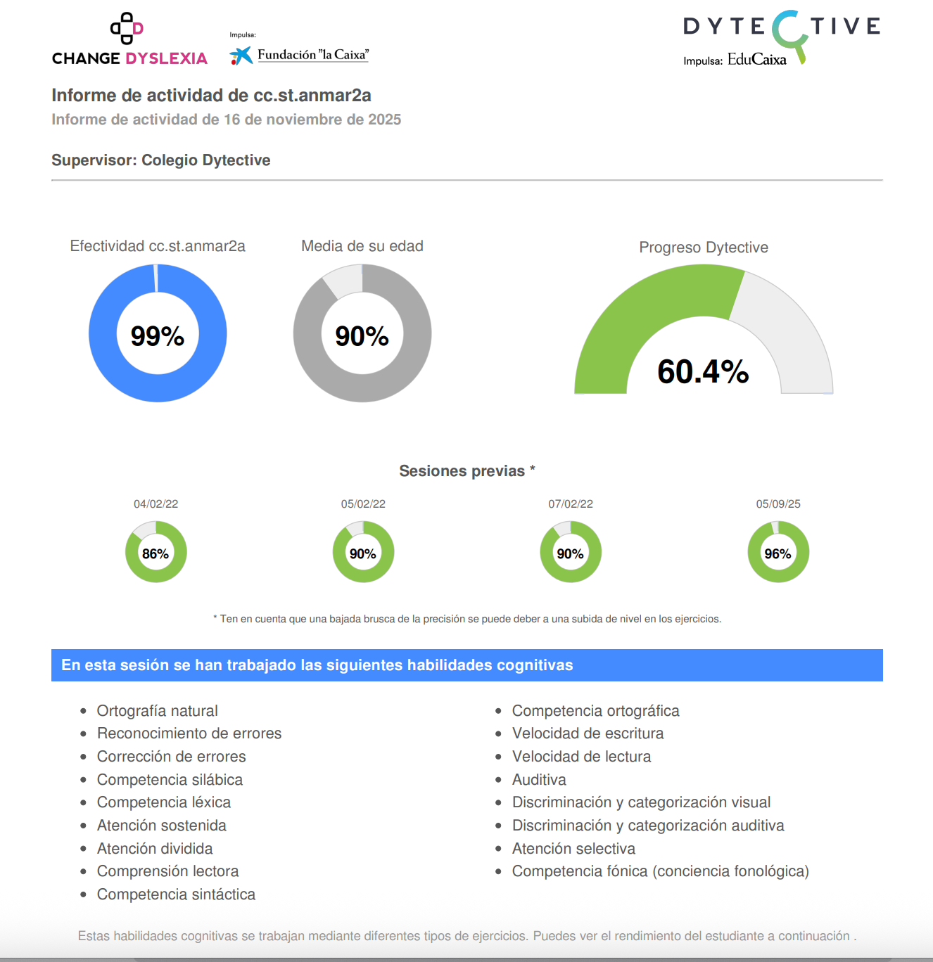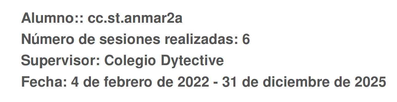 Este informe incluye la misma información que se puede consultar en la pestaña “Sesiones realizadas” del portal web de Dytective, presentada en formato PDF para su descarga y archivo.