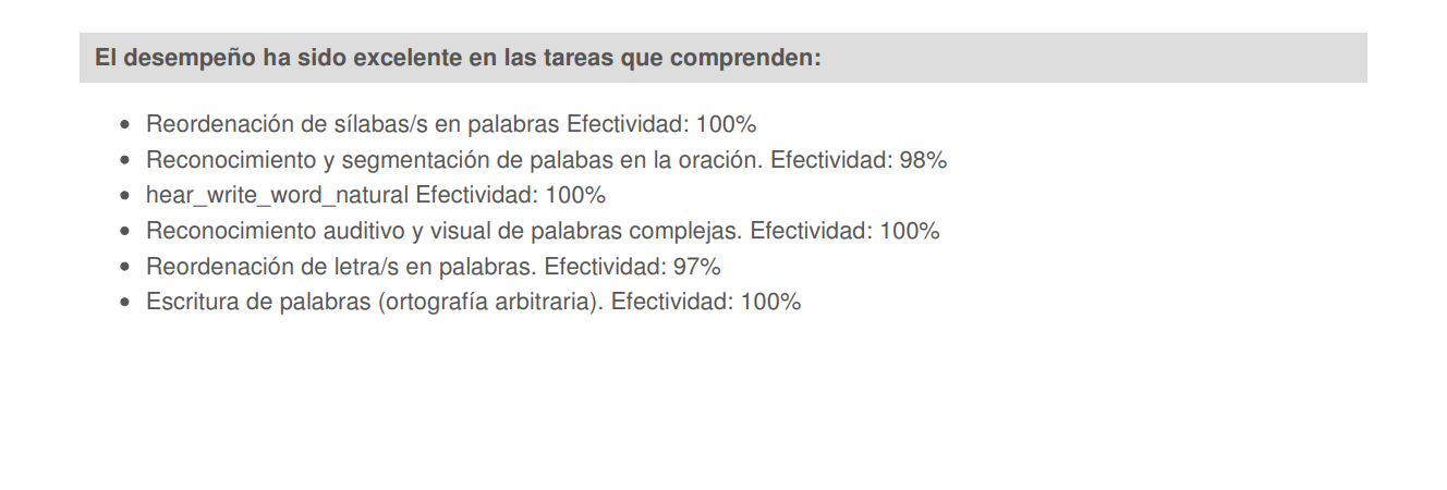 Resumen de habilidades clave en lectoescritura: El informe incluye un resumen del desempeño del estudiante en las ocho habilidades cognitivas y lingüísticas más relevantes para la lectoescritura: