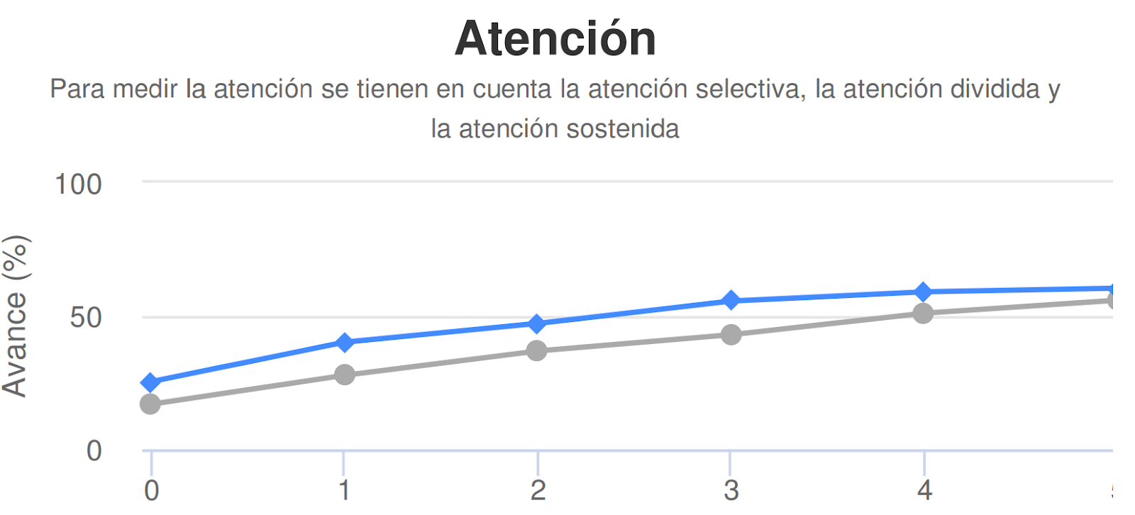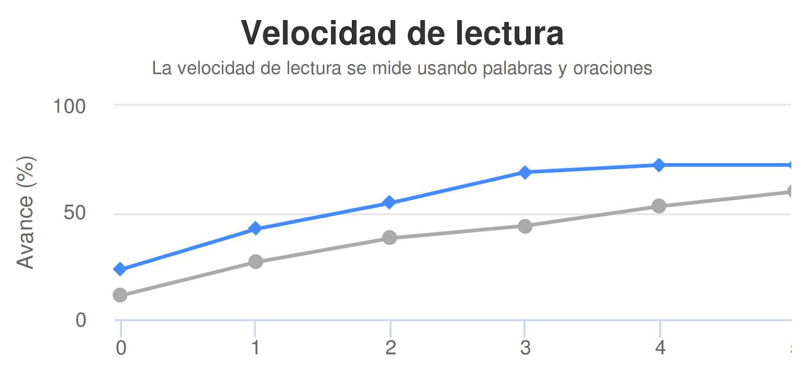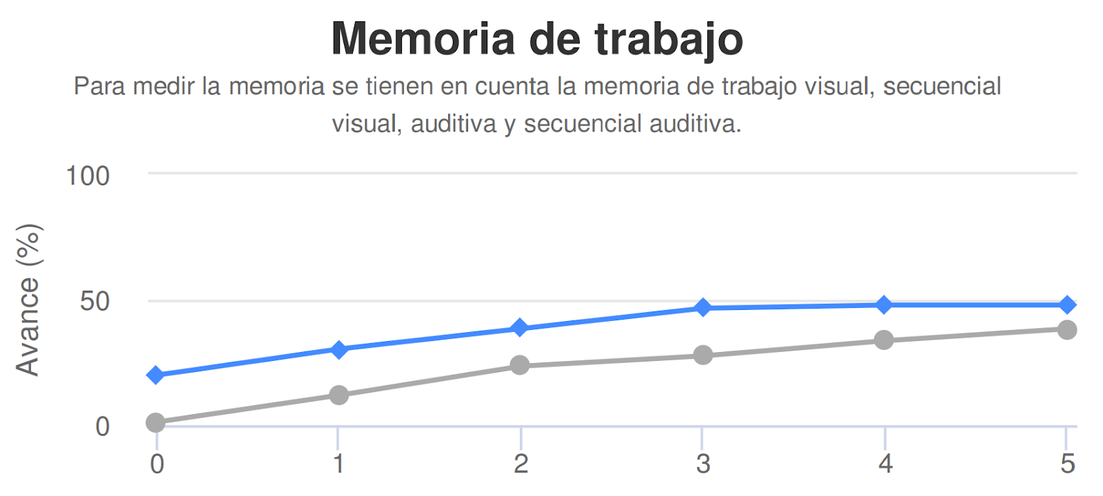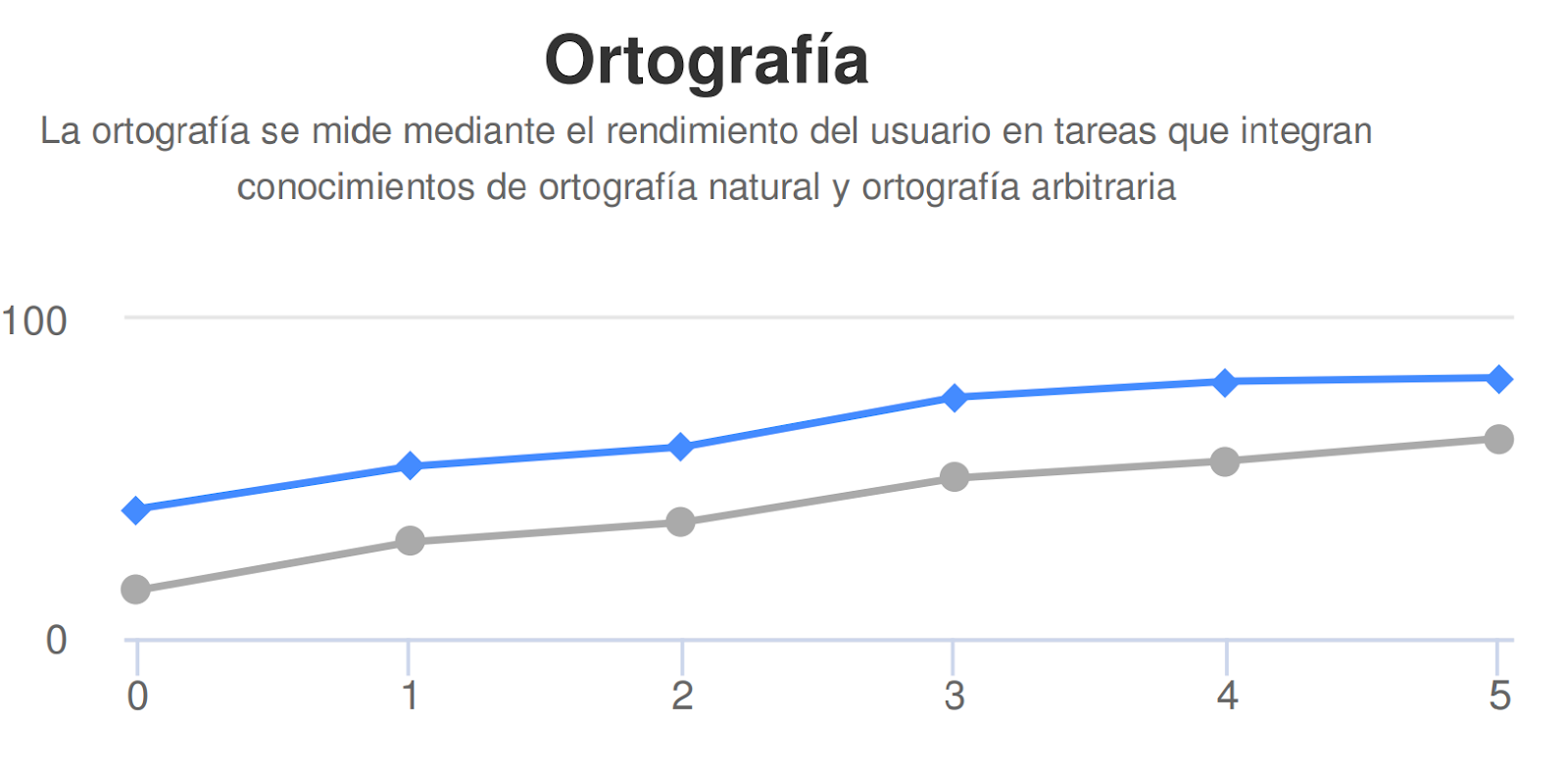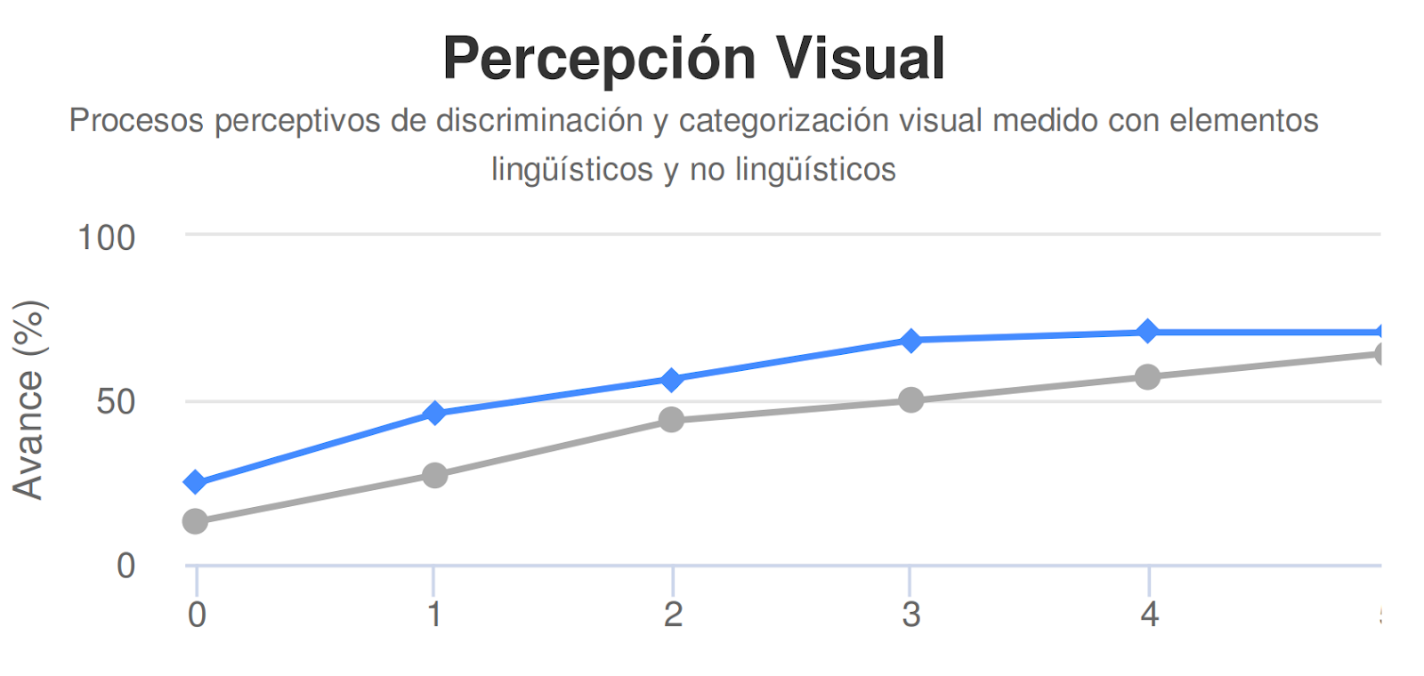 La línea azul muestra el progreso general del estudiante en las habilidades cognitivas y lingüísticas trabajadas en Dytective a lo largo del tiempo.