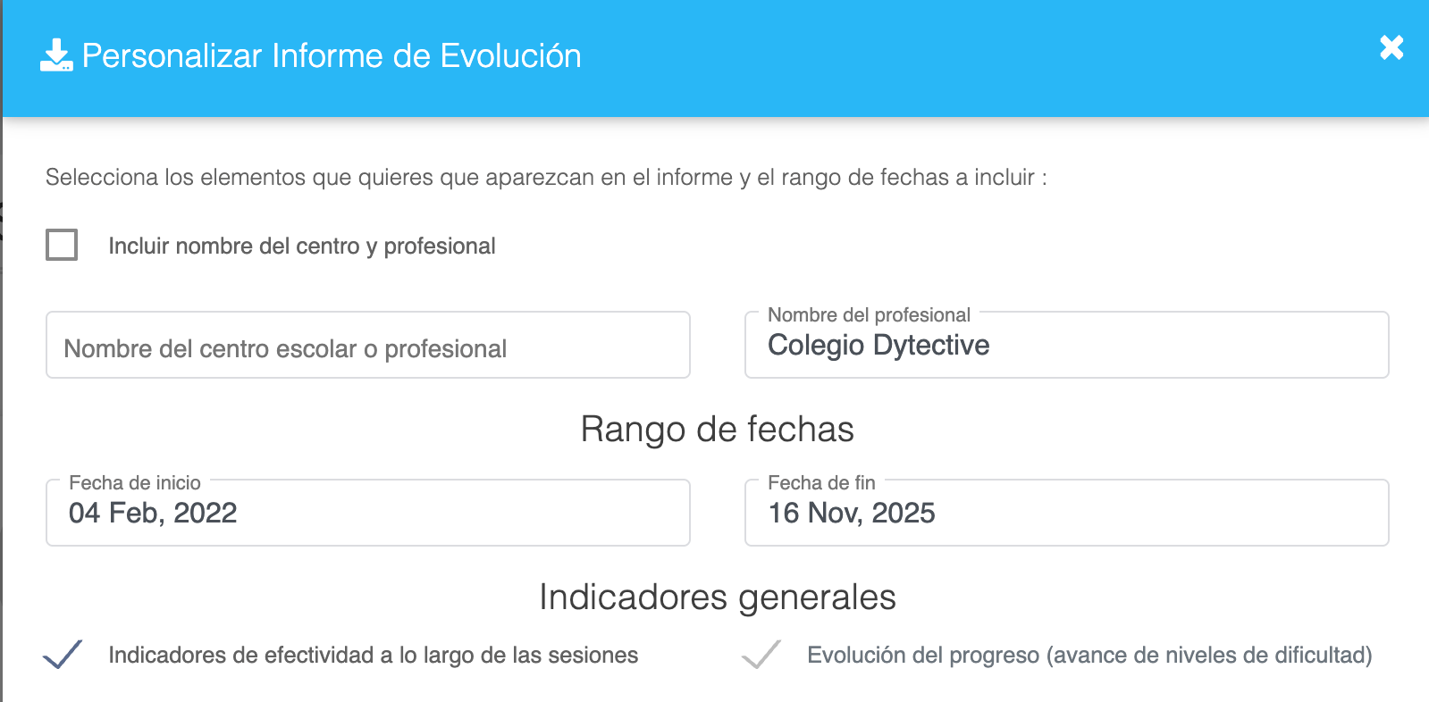 Cuando termines de configurar el informe, pulsa “Descargar” para obtener el PDF del informe de evolución.